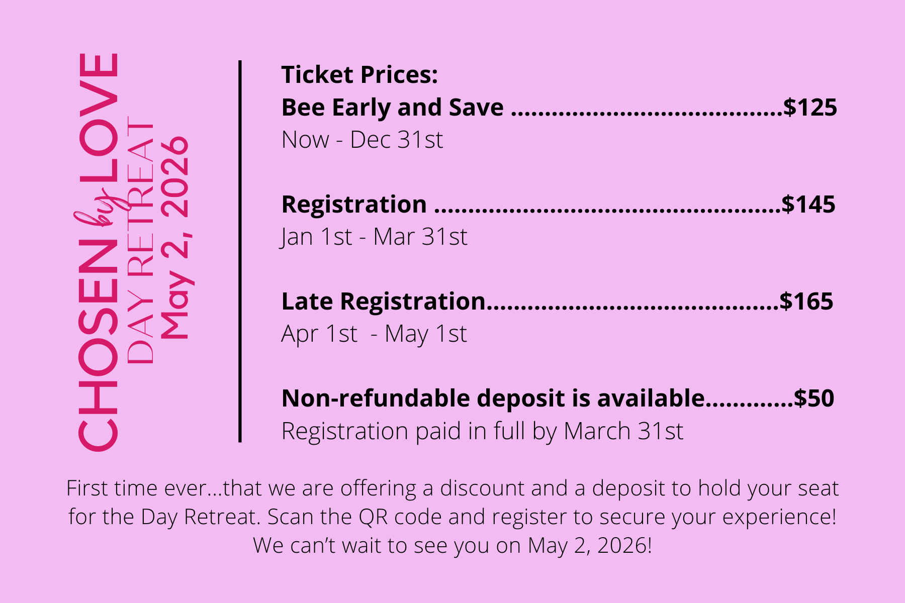 First Time Ever in the History of TRM: We are offering a payment plan to reserve your seat at the table for the 2026 Chosen by Love Day Retreat. In addition to that, you will save $40 when you make a $50 deposit by December 31st. The balance isn't due until March 31st, 2026.